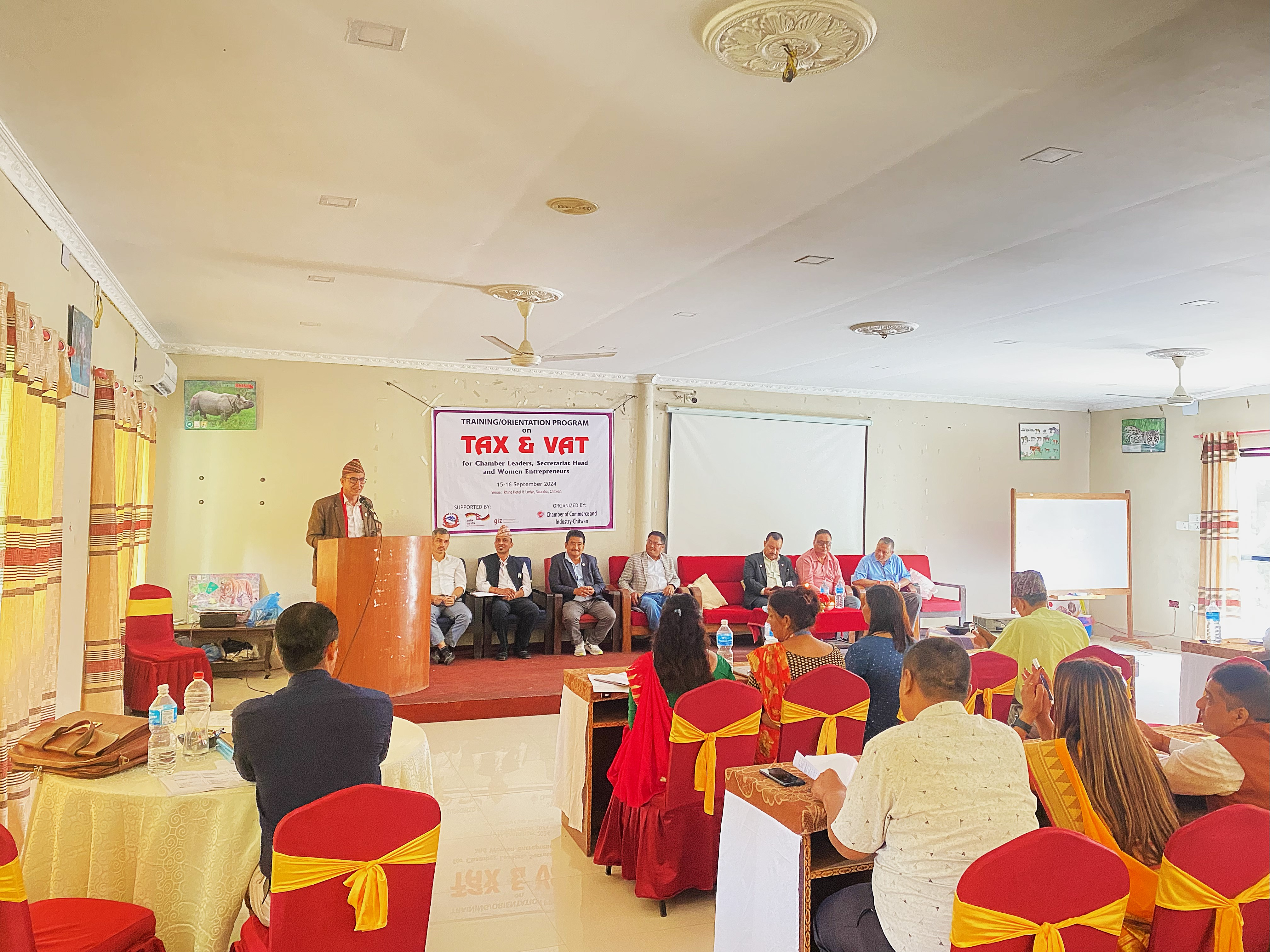 चितवनका उद्योगी व्यावसायीहरुको छाता संस्था उद्योग वाणिज्य संघ चितवनले छिमेकी जिल्ला नगर उद्योग वाणिज्य संघका अध्यक्ष, महिला उद्यमी लगायत कार्यालय प्रमुखहरूलाई लक्षित गरी कर तथा मूल्य अभिवृद्धि कर सम्बन्धी २ दिने अभिमुखिकरण कार्यक्रम सम्पन्न भएको छ । उद्योग वाणिज्य संघ–चितवनको आयोजना एवम् जिआईजेड रासकाे प्राविधिक सहयोगमा भदौ ३० र ३१ गते चितवनको पर्यटकीय नगरी सौराह स्थीत राईनो लज एण्ड होटलमा कार्यक्रम भएको हो । उद्योगी व्यवसायीहरुलाई कर तथा करका नीतिका बारेमा जानकारी गराउने उद्देश्यले कार्यक्रम आयोजना गरिएको थियो ।