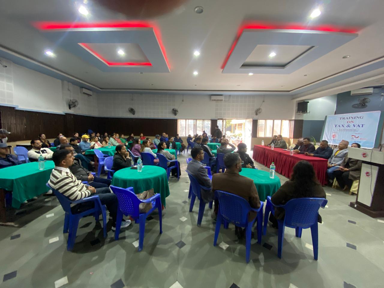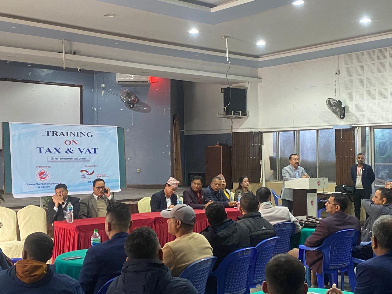चितवनका उद्योगी व्यावसायीहरुको छाता संस्था चितवन उद्योग वाणिज्य संघले कर तथा मूल्य अभिवृद्धि कर सम्बन्धी २ दिने तालिम कार्यक्रम सोमबार सम्पन्न भएको छ । तालिम उद्योगी व्यवसायीहरुलाई आयकर (Tax) तथा अभिवृद्धि कर (Vat ) लगायत मिसम्याच एवम् करका नीतिहरुका बारेमा जानकारी गराउने उद्देश्य तालिमको आयोजना गरिएको हो । तालिम चितवन उद्योग वाणिज्य संघको आयोजना एवम् GIZ Nepal को प्राविधिक सहयोगमा मंसिर २१ र २२ गते चितवन उद्योग वाणिज्य संघको सभाहलमा कार्यक्रम भएको हो ।